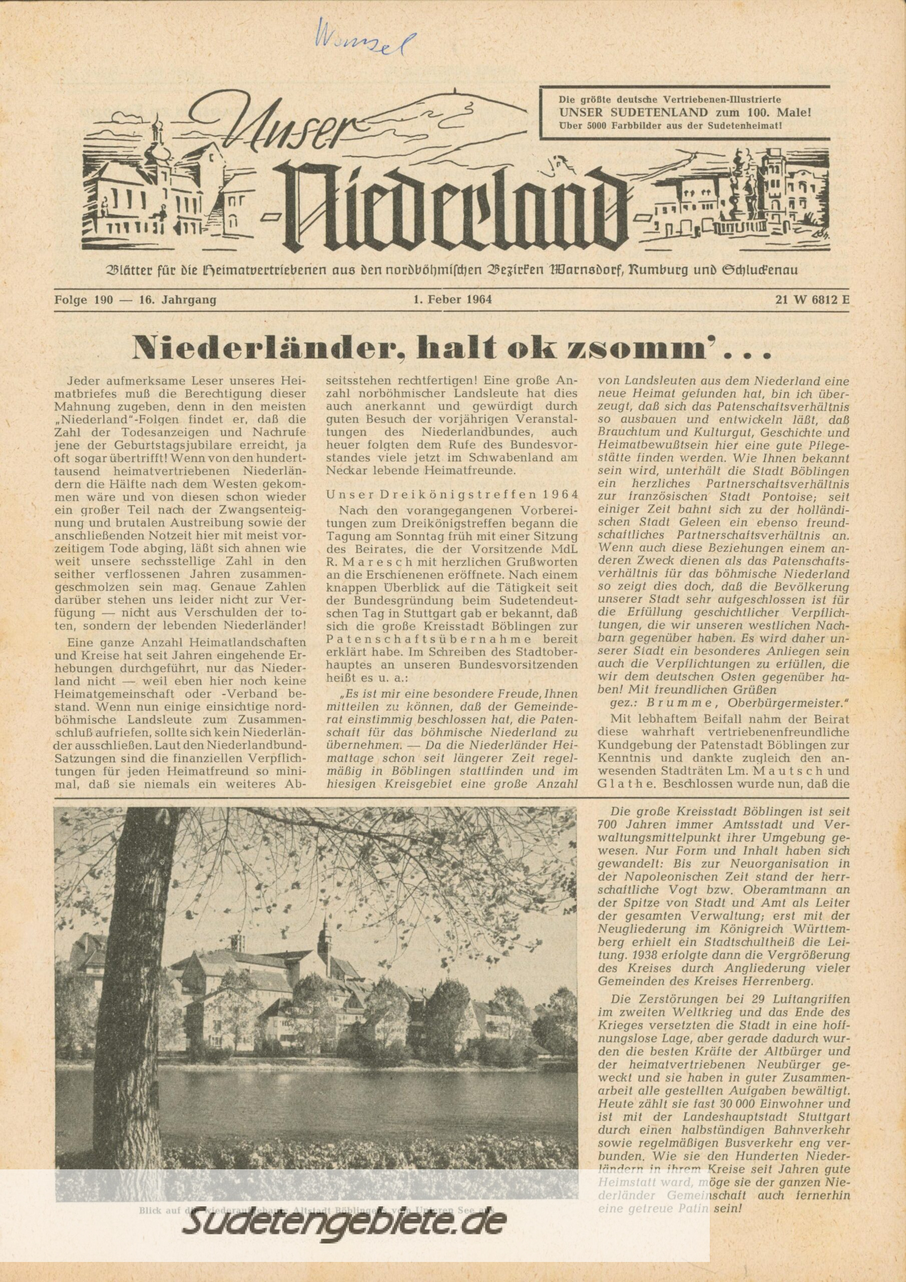 „Unser Niederland“ für die Heimatvertriebenen der nordböhmischen Kreise Warnsdorf, Rumburg, Schluckenau, mit der achtseitigen Heimat-Bildbeilage „Unser Sudetenland“.