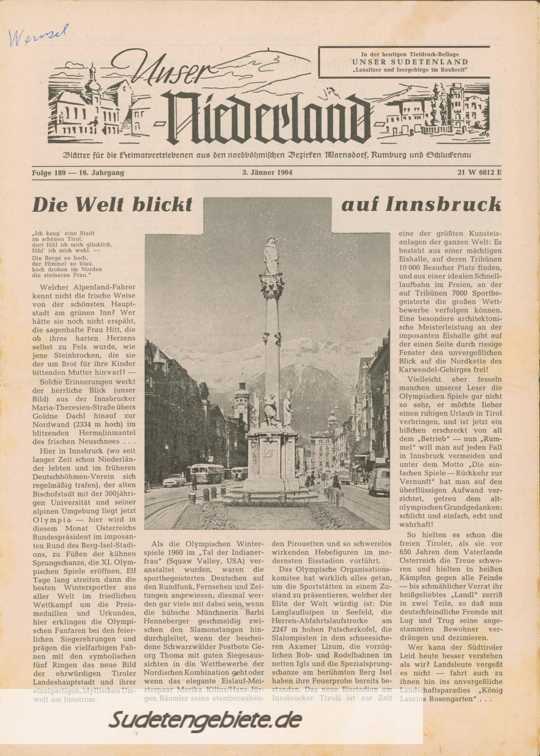 „Unser Niederland“ für die Heimatvertriebenen der nordböhmischen Kreise Warnsdorf, Rumburg, Schluckenau, mit der achtseitigen Heimat-Bildbeilage „Unser Sudetenland“.